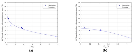 The damage data for Series 1 (composed of four test runs of 60%, 80%, 100%, and 120%) and Series 2 (composed of one test run of 100%) is described in the table below. For each test run, 10 observations are considered, obtained from five realizations in a model with a width of 54Dn50 (twice the considered characterization width of 27 Dn50). For these 10 observations and the 3 damage parameters, Table 3 and Figure 10 show the 80% confidence prediction interval, applying a Student’s t-distribution with a critical t-value of 1.383 () expressed as a percentage of the mean.