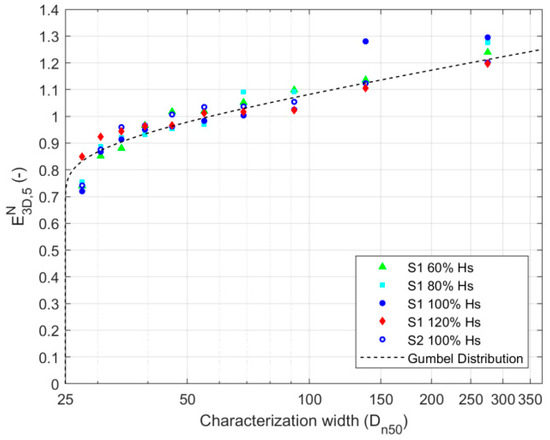 The main observation for the damage parameters E3D,1 and E3D,5 (also referred in general form as E3D,m) is that the measured damage continues to increase with increasing characterization widths. This suggests that there is no upper limit for the damage to the structure and that when considering wider structures, the probability of observing a larger extreme damage will continue to increase. Thus, besides considering the characterization width, this length effect for the design and characterization of coastal structures should then be taken into account (see Section 3.2.2 and [9]).