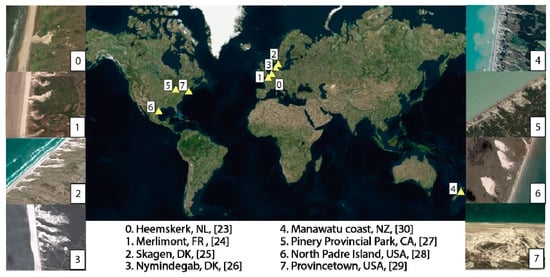 Notwithstanding the importance of blowouts in natural coastal dune systems, they are also crucial for applied coastal management purposes. Along many low-lying densely populated coasts, such as in the Netherlands, coastal management traditionally has focused on dune stabilization, including closing gaps in the foredune, planting vegetation, (e.g., [21,30,31]), and nourishments on the foreshore, the foredune and the beach, (e.g., [32,33]). Aside of dune stabilization by maintaining the foredune shape (by adding plants or sand), the stabilizing effect of foreshore- and beach nourishments on foredune morphology is based on the connection between nearshore-, beach morphology, aeolian sediment transport, and dune dynamics as shown by Short and Hesp [8]. Foreshore and beach nourishments at high-energy dissipative beaches get transported onto the foredune by prevailing high aeolian transport rates supporting the effectiveness of sand binding vegetation [13]. The combination of the above stated measures resulted in high and continuous vegetated foredunes, physically separating the beach (the main source of sediment input) from the back dunes, lead to loss of biodiversity (e.g., dune and dune slack habitats being replaced by fixed dune grassland and scrub) and extinction of rare plants and invertebrates which require open mobile conditions (e.g., [14,23,30,33,34]). However, recently, headed by examples from European coasts, a shift in coastal management strategy towards maintaining and reintroducing natural dynamic foredune systems with higher biodiversity and increased resilience against climatic changes and coastal erosion was observed, (e.g., [14,21,23,32,35,36,37,38,39]) (Figure 2). Initiation of artificially induced foredune blowouts turned out to be the most successful and sustainable management measure for dune reactivation [15,23,40]. This is due to the fact that foredune blowouts re-introduce interactions between the beach and the back dunes, (e.g., [23,38,41]). This reintroduced connection is intended to elevate stress factors (wind speed, sand supply, salt spray) in the back dunes, resulting in a sustainable increase in sand input and biodiversity. Re-establishment of extensive mobile foredune surfaces is unlikely to occur naturally at these stabilized systems. However it is possible to increase the mobility of the foredune system locally by either manually creating foredune blowouts or allowing natural blowout formation by discontinuing stabilization measures [14]. Unfortunately, in depth knowledge on blowout development over space and time at natural and managed coasts is still lacking.