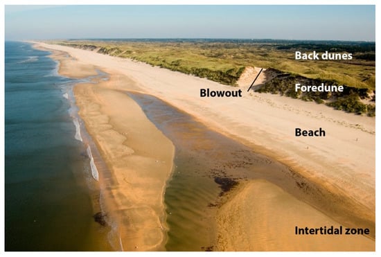 Coastline near Heemskerk, the Netherlands. The used Terminology indicates the location of the intertidal zone, dry beach, foredune, back dunes and a natural blowout (photo: Rijkswaterstaat/Rens Jacobs, 2005).