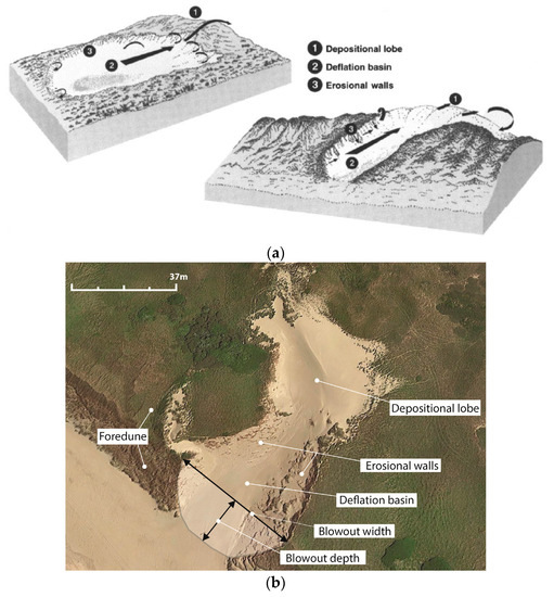 Developed blowouts, trough- or saucer-shaped, can be characterized by the following morphological features: a deflation basin, a depositional lobe, and erosional walls (Figure 4a,b [10]). Blowout topography becomes more pronounced throughout its development when sand is removed from the deflation basin and the walls, transported downwind and deposited on the depositional lobe or further in the back dunes. Its development marks the transition between the geomorphological and bio-geomorphological phase described in Figure 3. Distinct processes drive the development of (a) trough and (b) saucer blowouts.