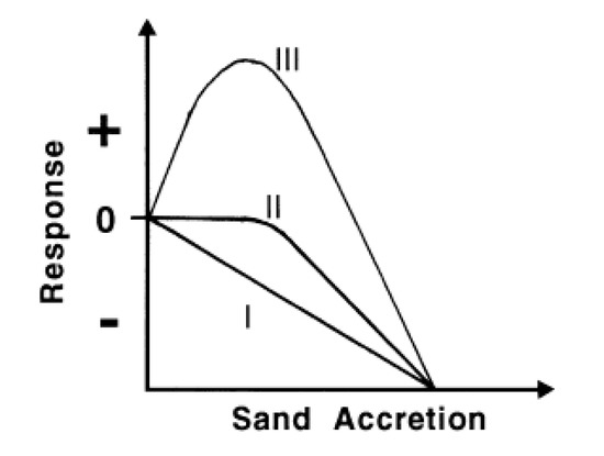 Plant response to sand accretions for three different vegetation types: (I) burial-intolerant, (II) burial-tolerant, and (III) burial dependent. From Maun [74]. This figure has been adapted from [74], with permission from Canadian Science Publishing.