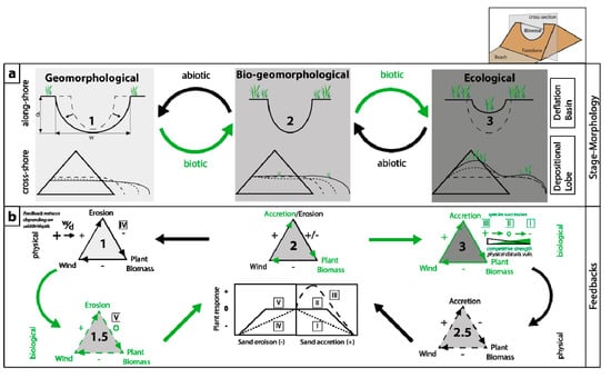 Foredune and foredune blowout evolution reflect the aggregation of both environmental (abiotic) and ecological (biotic) processes. Abiotic processes such as aeolian sand transport, wind speed, rainfall, and temperature, and biotic processes, such as vegetation establishment, growth (rate and period) and competition are important determinants for the presence of blowouts, their development cycles and thus active or stabilized dune development, (e.g., [10,14]). However, biotic and abiotic processes do not operate independently, leading to the recognition that abiotic-biotic feedbacks are critical for some stages in dune and blowout development. Previously, Corenblit et al. [42] proposed four bio-geomorphic succession-phases for biotic-abiotic systems as river floodplains, salt marshes, mangroves, and coastal dune systems: geomorphic, pioneer, bio-geomorphological, and ecological. However in respect to the development of foredune blowouts we here merge the pioneer phase with the bio-geomorphological phase since small seedlings can already create shadow dunes and thus facilitate bio-geomorphological feedbacks (Figure 3) [42]. We thus propose three successional phases depending on the relative importance of biotic and abiotic processes in blowout dynamics: geomorphologic, bio-geomorphological, and ecological [42,43,44] (Figure 3). The geomorphologic phase is dominated by physical disturbances such as floods, storms or tsunamis, with landform dynamics being dominated by hydrodynamic and aerodynamic forces and intrinsic cohesiveness of the sediment. During this phase, the dispersal of plant diaspores (e.g., seeds or rhizome fragments), their germination, growth, and survival on bare sediment is controlled by the geomorphic environment [42]. The bio-geomorphological phase is characterized by bio-morphodynamic feedbacks, where morphology and biomechanical plant properties interact with the substrate and geomorphic flows (e.g., aeolian sand transport). In the absence or low frequency of major physical (abiotic) disturbances, changes in the geomorphic environment are controlled by plants (ecological phase), resulting in changes in physiochemical soil properties, stabilization of the ecosystem and the increased importance of ecological interactions (e.g., competition, facilitation) [42,45]. In the context of blowouts these three successional stages can be linked to morphological development. Blowout initiation is governed by abiotic processes such as wind and sediment transport indicating the geomorphologic phase. Blowout development is governed by the interaction between sediment transport and vegetation indicating the bio-geomorphological phase. And blowout closure is mainly governed by vegetation re-colonization indicating the ecological phase.