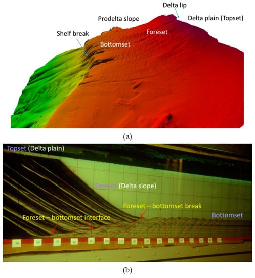 Terminology for fine-grained and coarse-grained deltas: (a) 3-D view of the Mazzarrà river delta, Italy. The location of the delta plain/ lip is only tentative as the 3-D coverage does not extend to the delta plain. The flow was from right to left. (b) Gilbert-type delta reproduced experimentally at St. Anthony Falls Laboratory, USA (Experiment 2 in Kostic and Parker []). The flow was from left to right.