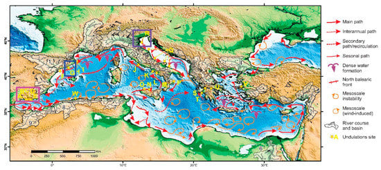 Distribution of sediment waves on deltas of the Mediterranean Sea (yellow stars) in relation to surface oceanographic circulation patterns (Adopted from Reference [], have got the permission from Springer Nature). Upper-flow-regime bedforms formed by turbidity currents due to hyperpycnal flows can be expected on the deltas of Mediterranean Andalusia (blue rectangle), Po river delta (pink rectangle), and the Llobregat river delta (purple rectangle). Image curtesy of Roger Urgeles.