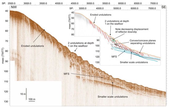Seismic profile of sediment waves on the Llobregat prodelta slope (Adopted from Reference [], have got the permission from Springer Nature). Waves are rooted at the Maximum Flooding Surface (MFS). The inset explains the interpretation of sediment waves as sediment transport features. Image curtesy of Roger Urgeles.