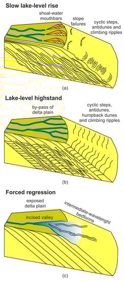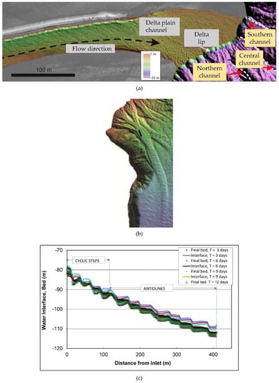 Deltas can be classified based on a variety of criteria. The most conventional, process-based classification defines delta types depending on the relative contribution of fluvial, wave, or tidal energy flux that was dominant during deposition at the seaward edge of the delta [,,]. Other classifications of deltas emphasize foreset/topset geometry [,], sediment grain size [], or delivery system type [,,]. More recent studies demonstrate that external geometry and internal characteristics of deltas greatly vary in response to the falling and rising of sea level [,,,,]. This paper focuses on upper-flow-regime bedforms observed on diverse deltas in marine and lacustrine settings at water depths of up to about 150–200 m. Parts of deltas that extend beyond water depths of 200 m are not investigated herein.
