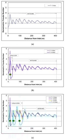 Plot of densimetric Froude number in the Northern channel: (a) Sediment waves form as antidunes. (b) First cyclic step emerges in time. (c) More antidunes get reworked into a train of upslope-marching cyclic steps after 12 days. Green circles in (b) and (c) show the location of internal hydraulic jumps.