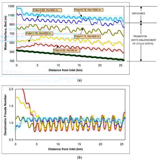 Hydrodynamic response of turbidity currents to intermediate-wavelength numerical sediment waves (Adopted from Reference []): (a) Bed and turbidity current interface profile for a range of inflow densimetric Froude number (Frdo) and assigned turbidity current inflow depths (Ho). (b) Corresponding plot of densimetric Froude number.