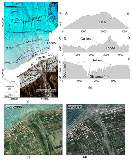 One of the main water courses debouching into the Gulf of Patti is the Mazzarrà river, which is credited with the formation of the deltaic system shown in Figure 7a,b. The Mazzarrà river drainage area encompasses 120 km2 and has a maximum elevation of about 1200 m. Its course is about 25 km long, with slopes ranging from 25° in the upper reach to 0.3° in the 2 km wide coastal plain (the average slope is around 5°). Maximum river discharge is estimated to be between 500 and 780 m3/s for the recurrence period of 50 and 300 years, respectively []. The drainage basin is largely affected by shallow instability processes occurring in strongly fractured basement rocks and flyschoid deposits, which can be easily remobilized during flash-flood events and can trigger the formation of mud/debris flows. A time lapse analysis of aerial photos for the period 2002–2014 has revealed the active coastal zone at the Mazzarrà river mouth. The documented progradation of the coastline between 2006 (Figure 7c) and 2012 (Figure 7d) is likely in response the 2011 flash-flood event. At a relatively longer timescale, a comparison of the 1884’s and recent aerial photos shows that the Mazzarrà river mouth was previously formed by two main channels (Figure 7a), whereas it is confined within the main eastern channel since the 1960–1969 period (Figure 7c,d).