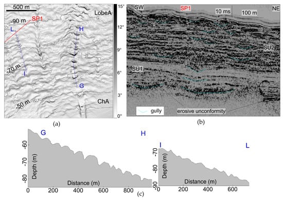Distal portion of the Mazzarrà delta: (a) Slope gradient map with isobaths (10 m equidistance) illustrates that gullies with associated confined bedforms largely cut the outer shelf-upper slope. (b) The chirp profile (location shown in (a) as a red line) reveals shallow gullies on the left, which are confined in the sedimentary cover above the erosive unconformity. On the right, two markedly erosive gullies are present, largely cutting the basal unconformity. (c) Bathymetric profile (location shown in (a) as a blue line) along the thalweg of the main gully, revealing a coaxial train of bedforms.