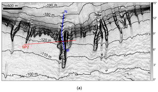 Gullies are observed all along the deltaic system and in the upper slope. They vary in length (550–2440 m), width (80–300 m), and channel depth (0.3–3.5 m). In general, gullies are narrow and shallow on the shelf, while they increase in width and channel depth on the outer shelf-upper slope, where a marked increase in slope gradients is also present (Figure 9a). In a few cases, gullies eroded the erosive unconformity that delimits the base of the deltaic deposits (Figure 9b). Gullies are also observed in the sub-seafloor as relict features (light-blue lines in Figure 8b). The larger gullies are observed on the unconformity surface and just above it on the outer shelf; they decrease in number and size within the transparent units. A marked increase in number of gullies is observed in the upper stratigraphic levels, with a main concentration in the area between the two branches (present-day and historical) of the Mazzarà river mouth.