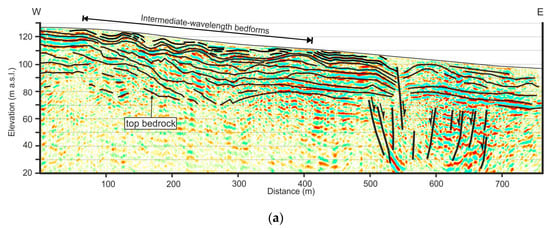Bedforms emplaced by tractional supercritical currents: (a) Shear-wave seismic profiles of the Emme delta, showing intermediate-wavelength bedforms that developed on the delta plain and upper delta slope in front of an incised valley (Adopted from Reference []). (b) Isolated scour filled with backsets on top of truncated foreset beds (Betheln delta).