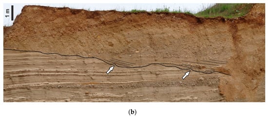 (b) Bedforms emplaced by surge-type supercritical turbidity currents): Foreset beds, deposited by surge-type supercritical turbidity currents, comprise laterally and vertically stacked cyclic step and antidune deposits, which form meter-scale fining-upward sequences (Figure 12a). Individual foreset beds are 5 to 70 cm thick and consist of medium to coarse-grained sand, pebbly sand and gravel. Cyclic-step deposits are represented by lenticular scours, 0.9 m to more than 4 m long and 0.1 to 0.7 m deep. These scours are commonly isolated and widely spaced, have scooped basal erosional surfaces and are filled by backset cross-stratified pebbly sand and gravel. The gravelly scour fills commonly display an upslope dipping steep-clast fabric with no preferred orientation of the clast axes and fine upwards. Sandy scour fills may have a massive, diffusely graded or deformed basal part, passing upslope into backset cross-stratification. The soft-sediment deformation structures comprise convolute bedding, flame structures and clastic dykes. The scour fills are overlain by sheet-like, 5 to 15 cm thick beds of low-angle cross-stratified or sinusoidally stratified sand and pebbly sand, deposited from antidunes. The sheet-like beds commonly have erosional basal contacts and display frequent internal truncations and small-scale concave-up scours, but lateral transitions from the scour fills into the sheet-like beds are also observed. Locally, beds are draped by thin (0.5–1 cm) massive silty fine-grained sand layers. Upwards, the thickness of bedsets commonly increases and sigmoidally stratified pebbly sand occurs. The tops of the fining-upward successions are formed by thin beds (1–10 cm thick) of climbing ripple cross-laminated silty sand or massive silt and mud. The occurrence of isolated cyclic-step deposits associated with antidune deposits may indicate deposition by waning turbidity currents at the lower limit of the cyclic-step stability field and the superimposition of antidunes on cyclic steps [,,]. Alternatively, more isolated hydraulic-jump deposits may reflect rapidly decelerating and expanding low-efficiency flows, or short delta slopes, which prevent the re-establishment of supercritical flow conditions []. Drapes of silty fine-grained sand point to phases of suspension fall-out between the individual surges. The formation of dewatering structures in some scours indicates rapid suspension settling and pressure fluctuations in hydraulic-jump zones [,]. Lateral transitions from the scour fills into antidune deposits indicate the re-establishment of supercritical flow conditions on the stoss-sides of cyclic steps [,]. The occurrence of more extensive antidune deposits in some foreset beds points to temporarily relatively lower Froude numbers within the supercritical density flows []. Scouring within the antidune deposits may relate to antidune-wave breaking [,].