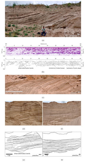 Sedimentary facies of delta foresets: (a) Sandy foreset beds, deposited from surge-type turbidity currents (Porta delta). (b–g) Sandy foreset beds, deposited from sustained turbidity currents (Freden delta), with (b) showing GPR profile (200 MHz); (c) showing outcrop analogue of lower delta foreset beds with backset cross-stratification and sigmoidal cross-stratification, displaced by shear deformation bands (Adopted from Reference []); and (d–g) showing photographs and line drawings of delta foreset beds with cyclic step and antidune deposits (Adopted from Reference []).