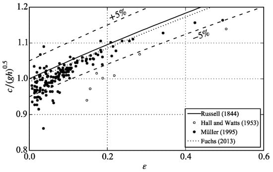 Relative wave crest celerity c/(gh)0.5 versus relative wave amplitude ε from data sources from Müller [], Hall and Watts [], and Fuchs [] and (—) solitary wave celerity (Equation (7)).