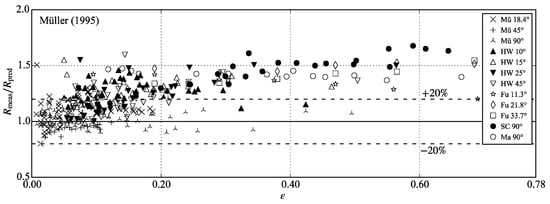 the measured impulse wave celerities mainly scatter between 95% and 103% of the solitary wave celerity. This agrees with the findings by McFall and Fritz [] and Evers et al. [] for spatial impulse wave propagation in wave basins. The relative wave length L/h of Müller’s [] experiments range between 9 and 56. According to Dean and Dalrymple [], the generated waves cover the transition zone from intermediate-water (2 < L/h ≤ 20) to shallow-water (L/h > 20). The measured wave celerities confirm this classification. In line with the additional text information in Müller [], experiments no. 474, 589, 601, and 602 were not included in the analysis. The experiments featuring roughness elements at β = 18.4° (no. 562–588) were also not considered. All other experiments from Müller’s [] appendix providing sufficient information on the impulse wave characteristics as well as the runup height were included in the analysis. The number of experiments included from Müller [] is n = 166 (63 at β = 18.4°, 17 at β = 45°, 86 at β = 90°).