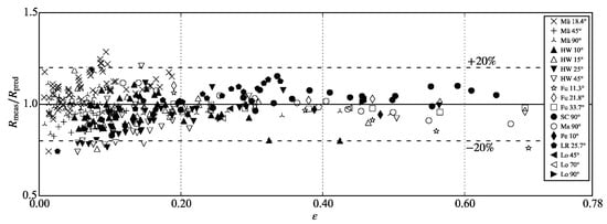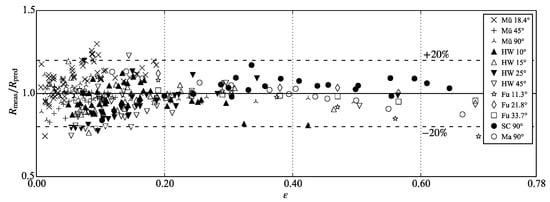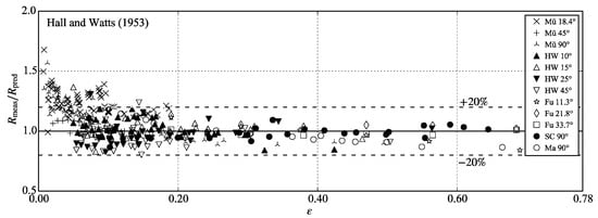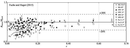 Measured over predicted (Equation (4) by Fuchs and Hager []) runup height Rmeas/Rpred versus relative wave crest amplitude ε for experiments from data sources from Müller (Mü) [] (without β = 90°), Hall and Watts (HW) [], and Fuchs (Fu) [].