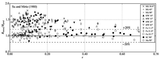 Measured over predicted (Equation (6) by Su and Mirie []) runup height Rmeas/Rpred versus relative wave crest amplitude ε for experiments from data sources from Müller (Mü) [], Hall and Watts (HW) [], Fuchs (Fu) [], Street and Camfield (SC) [], and Maxworthy (Ma) [].