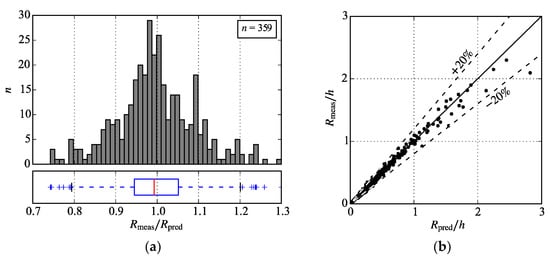 The first bracket includes Equation (6) by Su and Mirie [] and the second bracket includes the effect of β from Equation (1) by Müller []. For β = 90° the latter term equals to 1 and for β = 10° it is approximately 1.55, i.e., the runup height increases with decreasing β. The measured runup heights scatter within circa ±25% of the prediction (Figure 10). The 2.5th and 97.5th percentile whiskers in Figure 11a show that more than 95% of the experiments are within a ±20% range. The maximum deviations of single experiments are within ±30%. These experiments include ε < 0.2 as well as large ε at comparatively gentle slope angles β = 10° and 11.3°. Figure 11b shows the direct comparison of the measured relative runup heights Rmeas/h versus the predicted Rpred/h.