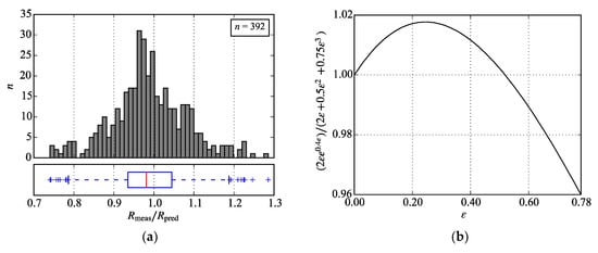 (a) Histogram and boxplot with whiskers at 2.5th and 97.5th percentile of measured over predicted (Equation (10)) runup height Rmeas/Rpred of the overall dataset; (b) 2εe0.4ε over Equation (6) versus relative wave amplitude ε.