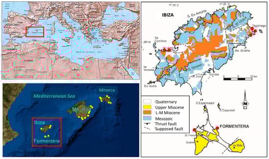 The island of Ibiza is located in the south-western Mediterranean Sea and is the third-largest (571 km2) and most Westerly Island of the Balearic Islands (Figure 1). Geological structure of the island is composed of a series of thrust sheets (mainly of Middle Triassic to Middle Miocene carbonate deposits) formed during the Alpine compression (Upper Oligocene to Middle Miocene) and trending NE-SW []. These thrust sheets correspond to the northeasterly continuation of the Subbetic Ranges in the southern Iberian Peninsula. Bedrock lithology of Ibiza is composed mainly of Miocene and Mesozoic carbonate rocks []. Muschelkalk limestone and dolomite, as well as Keuper marls and clays, constitute the Triassic materials of the island, whereas Jurassic limestone and dolomites and Cretaceous to Middle Miocene limestone overlie the Triassic materials and constitute the significant reliefs of the island. Quaternary fluvial, alluvial and colluvial sediments fill the central basins, whereas Pleistocene coastal successions characterized by shallow-marine to coastal aeolian and colluvial deposits crop out patchily along the cliffed coasts [].
