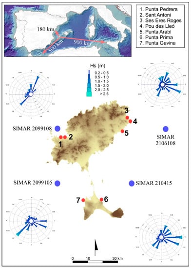 The Mediterranean basin is characterized by a highly indented coastline that creates some small and well-defined sub-basins, where wave energy is conditioned by wind speed and limited fetches []. In the western Mediterranean, the most intense waves come from the NE [], although the NW also generates strong waves between the Balearics, Corsica, and Sardinia as well [].