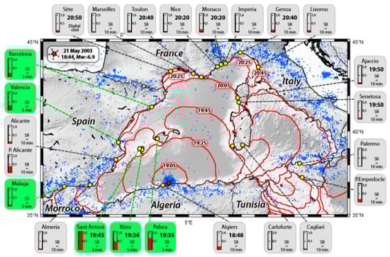 Modeling estimated travel time and impact areas based on the tsunami records of 21 May, 2003 []. Blue dots record background seismicity from 1998–2005 (CSEM-EMSC). Green rectangles record tide gauges with precise sampling rates.