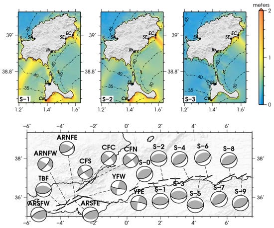 Reference [] used 22 tsunamigenic seismic sources to estimate the tsunami threat over the Spanish Mediterranean coast of the Iberian Peninsula and the Balearic Islands. They modeled tsunamis generated from seismic sources of N Africa, from the Alboran Sea to N of Algeria. According to [], the sources of the N of Algeria S-1 and S-2 (Figure 4) are those that most affect the coasts of Ibiza and Formentera and have maximum wave height values of more than 2 m in the S of both islands, especially S of Formentera, where values higher than 4 m reach the Cap de Barbaria. In addition to these two principal sources, sources S-3, S-4, and S-6 can also generate wave elevations close to 2 m. The seismic sources S-0 to S-9 are located N of Algeria (S-0 to the west and, progressively, S-9 to the east, Figure 4). The model considers a 7.3 earthquake magnitude and the seismic sources S-0 to S-9 consists of low-angle reverse faults, 55 km in length, verging towards the N and NW.