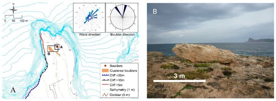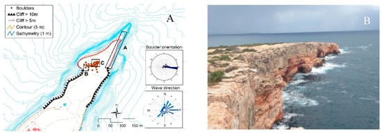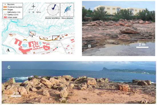 (A) Geomorphological scheme of the Sant Antoni area. Roses show the dominant orientation of boulders (left) and the prevailing waves (right). (B,C) Ridges of boulders very close to sea level at Sant Antoni.