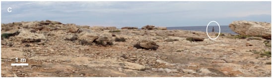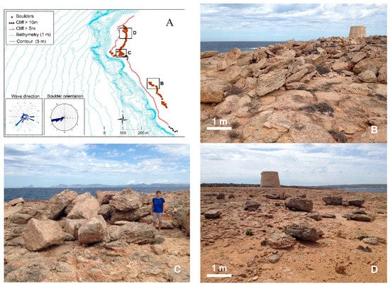 In Formentera island, boulders remain in the areas of Punta Prima, in the E of the island, and Punta de sa Gavina, in the W (Figure 2) [,]. These two areas, formed by Miocene calcareous materials, stand out for presenting metric size boulders at distances tens of meters away from the cliff edge and with heights higher than 11 m a.s.l. The sites are associated with several littoral terraces with heights between 5 and 15 m a.s.l.