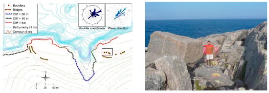 There is evidence that rocky coasts are sensitive to high-energy events such as storms [], hurricanes, typhoons, or cyclones [] and tsunamis []. One of the main effects of the tsunamis on rocky shores is represented by the presence of mega boulders displaced inland []. The identification of these boulders transported by tsunamis or storms is essential for the recognition of the occurrence of events produced in the past [], as well as to estimate the hydraulic properties that have given rise to these []. The distinction of boulders associated with tsunamis is based on a set of sedimentological, morphological, chronological, stratigraphic, and organizational criteria that can be analyzed in detail. Being the deposits of boulders imbricated and aligned along the coast, they show clear transport indicators associated with tsunamis []. In the last decade, the debate regarding on the transport of boulders to discern their origin between tsunamis and large storms has forced to researchers to further consider in more detail the role of storms on the rocky coasts []. Some equations have been developed to estimate the over-elevation by lift or run-up necessary on a block, under three assumptions: submerged boulders, subaerial boulders, and boulders delimited by joints or fractures [,].