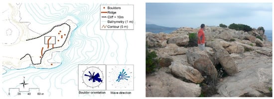 Geomorphological scheme of the Pou des Lleó area. Roses show the dominant orientation of boulders (picture on the right) and the prevailing waves.
