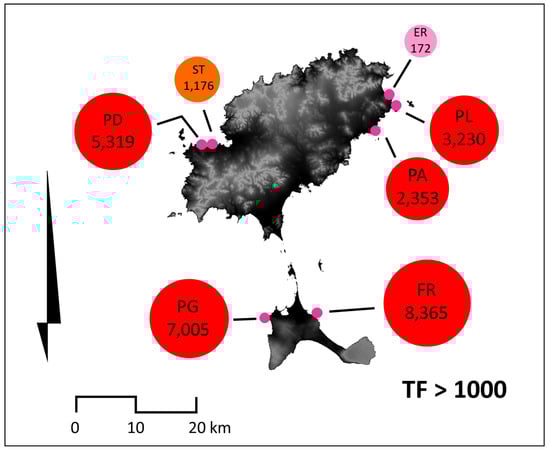 Average values of the Transport Figures for the boulders with TF > 1000. (PD, Punta Pedrera, ST, Sant Antoni, ER, ses Eres Roges, PL, Pou desLleò, PA, Punta Arabí, FT, Punta Prima, PG, Punta Gavina).
