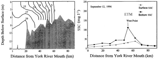 Observations of (left) salinity and (right) SSC along the York River estuary near slack tidal flow on September 12, 1996, adapted from Figure 5c of [83] with permission from RightsLink: Springer Estuaries, 19 Sept. 2019.