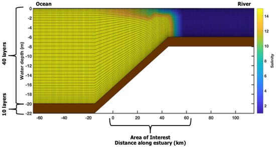 A model with the following idealized two-dimensional domain was designed to represent the longitudinal dimension of a micro-tidal, partially mixed estuary. The model represented salinity-driven estuarine circulation, but neglected across-channel variation. The primary features of the idealized simulation were similar to the main channel of the York (see Section 2.1), and the sediment characteristics were based on observed values from this system [17,38]. The idealized estuary was 180 km in total length, and the water column was partitioned into 40 vertical layers (Figure 3). A 60–km-long area of interest was in the center of the grid, with a buffer of about 60 km on either end (please note that in the figures, “0 km” marks the seaward end of the area of interest). The horizontal resolution was 500 m, and the vertical resolution varied with depth and ranged from 0.053–0.79 m, with higher resolution near the surface and the bed. Our analysis focused on the area of interest that encompasses the estuarine system with water depths of ~18 m at the seaward end to the head of salt at the landward end with a depth of 6 m. The full model grid included buffer regions to either side, to minimize the effects of boundary conditions within the area of interest. The model applied includes salinity dependence for flocculation. A natural system is likely to have different floc properties in the riverine portion due to an absence of salinity. The “riverine” section of our domain lies within the upstream buffer zone, outside our region of interest.