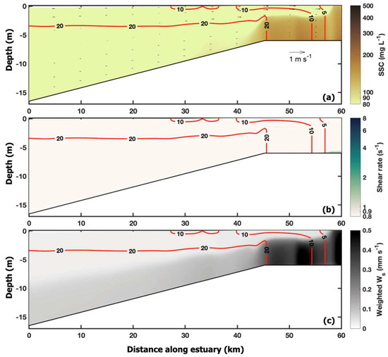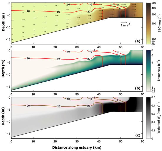 Suspended sediment concentrations (mg L−1; (a)), the shear rate (s−1; (b)) and the mass-weighted settling velocity (mm s−1; (c)) along the idealized estuary during flood tidal flow. The arrows in (a) represent the direction and magnitude of the along estuary flow velocity and the solid red lines represent salinity contours (1, 5, 10, 20).