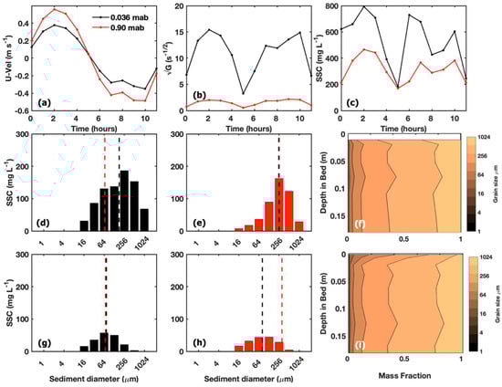 Higher in the water column (0.90 mab) at the ETM, the fluctuations in velocity were larger, but the shear and SSCs were smaller compared to near the bed (Figure 7a–c). The floc size distribution had a smaller concentration of the mid-sized sediment classes, which produced a larger D50 than near the bed. Unlike the near-bed, D50 at 0.90 mab equaled the predicted equilibrium D50 of ~256 μm at peak flow (Figure 7e), and was smaller at ~90 μm than equilibrium at slack water (Figure 7h). At slack flow, the D50 at 0.90 mab was similar to the value in the near-bed grid cell, as larger floc sizes had settled. The SSC at 0.90 mab was on average ~2 times smaller than at 0.036 mab (Figure 6c), whereas G1/2 at 0.90 mab was ~7 times smaller than at 0.036 mab (Figure 7b). Thus, differences in C/G1/2 and the equilibrium D50 very near the bed versus higher in the water column were driven more by differences in shear rate than by differences in SSC. Overall, the ETM concentrations and floc sizes simulated in this study were smaller than those predicted at 0.80 mab in the idealized ETM model for the Chesapeake Bay [91].