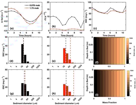 The hydrodynamic and sediment conditions for a tidal cycle, including the (a) along estuary velocity (flood positive), (b) square root of the shear rate, and (c) SSC near the bed (~0.078 mab; black lines) and 1.75 mab (red lines) at the downstream location outside of the ETM. The near-bed sediment size distribution at max flood (d) and slack after flood (g) and the distribution at 1.75 mab at max flood (e) and slack after flood (h). The mass fraction of the sediment classes in the bed at max flood (f) and slack after flood (i). In panels d, e, g, and h, the black dashed lines represent the D50 by mass and the red dashed lines represent the estimated equilibrium D50 by mass.