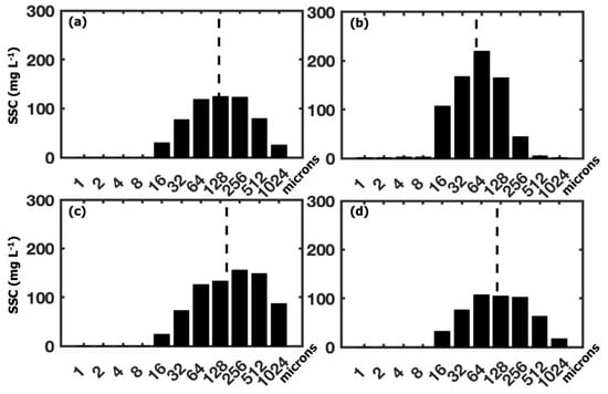 The time-averaged near-bed (0.036 mab) floc size distribution in the ETM region for the (a) reference, (b) no flocculation, (c) no consolidation, and (d) no stratification cases. Grain size (in microns) shown for each floc size class. Dashed vertical lines represent the D50 by mass for each case.