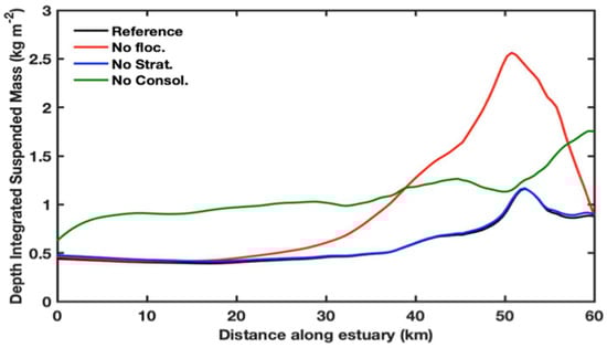 Density-induced stratification due to gradients in SSC did not significantly impact sediment patterns; the size distribution of suspended sediment was similar to the distribution calculated when sediment-induced stratification was removed, the time averaged D50 was 123 μm for the reference case compared to 116 μm for the case that neglected sediment-induced stratification (Figure 9d). The depth-integrated suspended sediment mass throughout the estuary for the reference case was nearly identical to the no stratification case (Figure 10). These results indicate that the SSC gradients estimated in this set of model runs were not sufficient to induce significant stratification. The gradient Richardson number (Rigrad; Equations (3) and (4); [93]) was calculated for 0.5 and 1.0 mab throughout the area of interest. Suspended sediment on average contributed minimally to the Rigrad. When the Rigrad exceeded the critical value of 0.25, SSC contributed 2.5% to the Rigrad at 0.5 mab, and 1.8% at 1 mab. Please note that the density of the flocs decreased with size, as was observed in the York River estuary (Table 1; [38]). Suspended sediment-induced stratification could be more important in situations where the density of large flocs did not decrease, where higher stresses or higher erodibility led to higher SSC near the bed, or where stronger temperature/salinity stratification more significantly enhanced sediment-induced stratification.