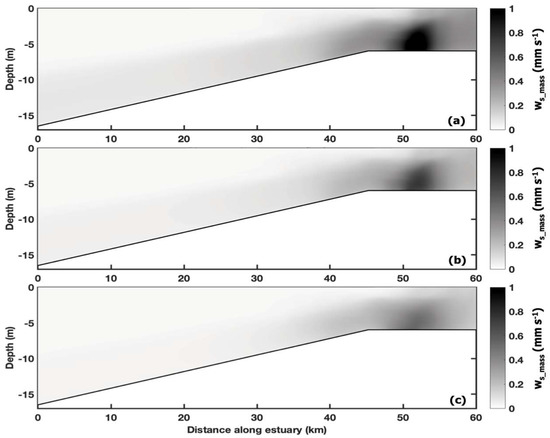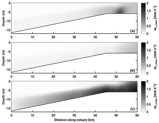 The average mass weighted settling velocity (ws_mass) along the estuary for the (a) reference simulation, (b) no flocculation run, and (c) no bed consolidation cases.