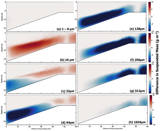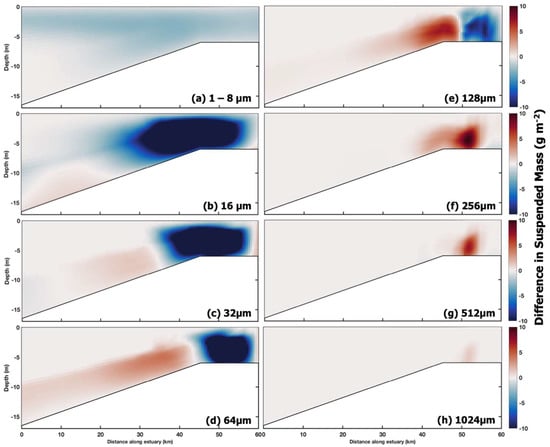 The time-averaged difference (the reference case minus the no consolidation case) in the suspended sediment mass for sediment size classes. Panel (a) shows the sum of size classes with diameters 1–8 μm because the pattern was similar; panels (b–h) show a single size class with the diameters indicated in the bottom right corner. Red indicates that including consolidation increased the concentration; blue indicates that it decreased the concentration.