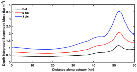 Time-averaged depth-integrated suspended sediment mass along the idealized estuary for the reference case (black line), which used 11 sediment size classes, and model runs using 5 (red) or 3 (blue) sediment size classes.