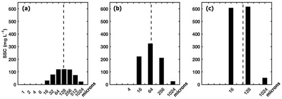 The time-averaged floc size distribution near the bed in the ETM region for the reference run with 11 sediment classes (a), 5 sediment size classes (b) and 3 sediment size classes (c). The dashed line represents the D50 by mass for each case.