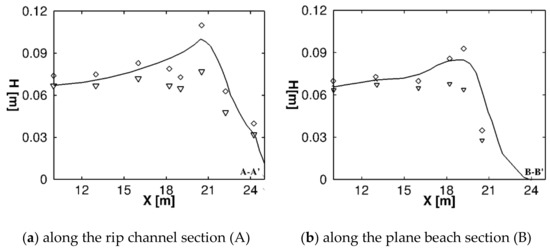 In Figure 2 we compare, along the two cross-sections, the wave heights obtained by the proposed model with the experimental results of Hamm [29]. From this figure, a good agreement can be noticed between the experimental and numerical results, for both the section placed in the sloping beach and the one placed in the rip channel.