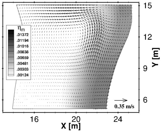 Figure 14 shows a plan view of the time-averaged (over 120 wave periods) velocity field near the bottom in which the nearshore currents are fully developed. From this figure, it is possible to notice the presence of a primary circulation characterised by onshore directed flow velocities over the barrier that return offshore at the gaps. In the same figure a secondary circulation it can be seen, opposite the primary one, that takes place near the shoreline. In fact, close to the shoreline, the wave set-up in the gaps is greater than the one in the lee of the barrier—this gradient in the mean water level drives converging currents that characterise the above mentioned four-cell accretive circulation pattern.