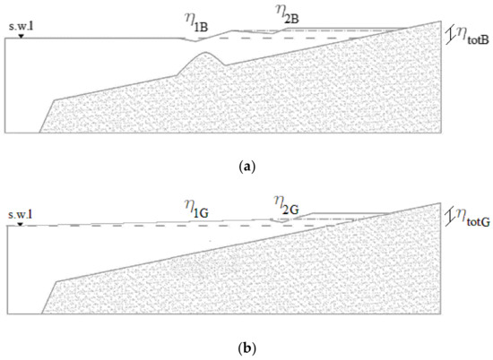 From a general point of view, in order to obtain accretive conditions, a system of submerged breakwaters separated by gaps has to produce a partial decrease of wave energy and wave height in the lee of the barriers such that the waves transmitted break closer to the shoreline than those at the gaps and with a smaller wave set-up . As shown by Ranasinghe et al. [30,31], for given wave characteristics (wave height and period), the main factors of a system of submerged breakwaters separated by gaps that can cause erosive or accretive conditions are: the water depth at the bar crest, ; the ratio between the length of the barrier and the gap width, ; the distance from shoreline to barrier, . All other factors being equal, as the water depth at the bar crest decreases, the wave height reduction of the transmitted waves increases. It can produce a wave set-up, , lower than the one produced by the waves passing through the gaps, (accretive conditions). Concerning the ratio between the length of the barrier and the gap width, , all other factors being equal, a reduction of increased the amount of water accumulated in the sheltered area. Consequently, near the shoreline, the wave set-up induced by the transmitted waves can be greater than the one produced by the waves passing through the gaps, (erosive conditions). On the contrary, as the distance from shoreline to barrier increases, all other factors being equal, the distance between the first and second wave breaking enhances, thus reducing the amount of water accumulated in the sheltered area. It can produce a wave set-up, , lower than the one in correspondence of the gaps, , (accretive conditions).