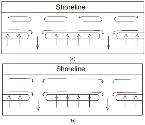Figure 4 shows a schematisation of the hydrodynamic effects produced by a system of submerged breakwaters on the mean water level: Figure 4a refers to a cross-section in correspondence with the barriers; Figure 4b refers to a cross-section along the gap between the barriers. As shows in Figure 4a, close to the submerged breakwaters, due to the wave breaking there is an increase in the mean water level with respect to the still water level (wave set-up ). On the onshore side of the breakwater, the wave breaking stops because the waves enter the relatively deeper waters in the lee of the breakwater, then the wave (which is now characterised by a new height) restarts to shoal until it breaks near the coastline. At the coastline, the total set-up with respect to the still water level is given by the sum of the two successive wave set-ups (). As schematised in Figure 4b, between the barriers, the incident waves propagate without being directly affected by the presence of the barriers and break near the shoreline. Consequently, in the gap between the barriers, the waves set-up is lower than the one () that takes place over the barriers (). This difference in the mean water level drives a rip current in the gap that is directed offshore. Furthermore, in the protected area between the barriers and the shoreline, the modifications produced on the incident waves by the presence of the barriers induce nearshore circulations which can be summarised in two different circulation pattern types.