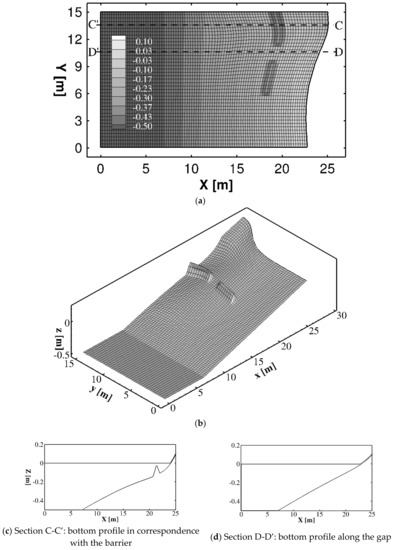 Figure 10a shows the bathymetry in the presence of the two submerged breakwaters for Case 2. A three-dimensional view of the bottom of the curvilinear computational grid is shown in Figure 10b. Figure 10c–d shows two significant cross sections: one in the gap between the barriers () and another over the barrier (). The incident wave conditions are the same as the previous case. From Figure 10 it can be noticed that breakwaters are approximatively 2 m more offshore than Case 1.